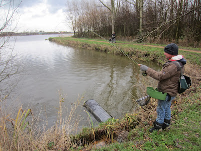 Niet veel later is het weer Marcel die een snoek vangt op de vliegenhengel. Hij haakt hem bij een waterafvoer. Ditmaal ben ik getuige en kan ik wat foto's maken: